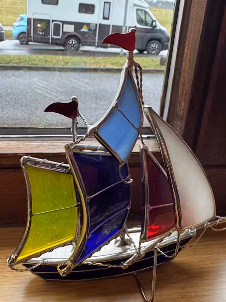 Schwierig, in dem vollen Cafe zu fotografieren. Hier ein Segelboot und ein Wohnmobil. Spannend: Genau die zwei Dinge die ich mag: WomoReisen und segeln.