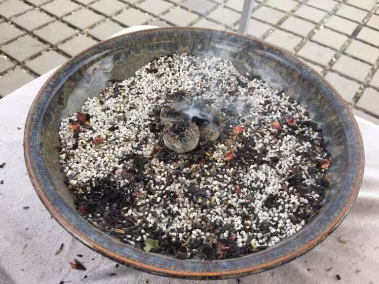 Wenn Du keine große Räucherausrüstung kaufen willst, genügt zu Beginn auch eine kleine Schale und ein paar Kräuter und ein Feuerzeug oder Streichhölzer. Die Kräuter können Salbei, Rosmarin oder Oregano sein. Auch Lavendel ist super. Oder auch Rosenblätter. Mit der Zeit merkst Du, dass nichts mehr sicher ist vor Deinen Versuchen den Duft zu erhaschen.