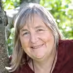 Andrea Sam guckt durch Baumgabelung