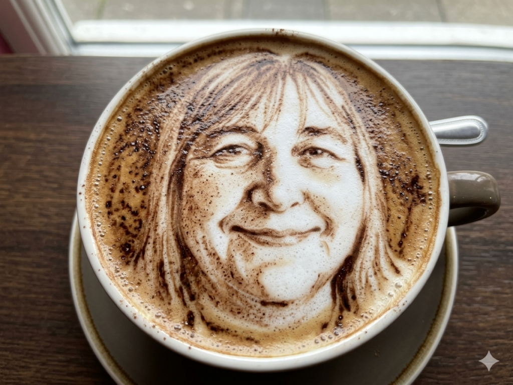 ein Foto von mir als Vorlage und Gemeni die KI erzeugte ein Latte Art Foto