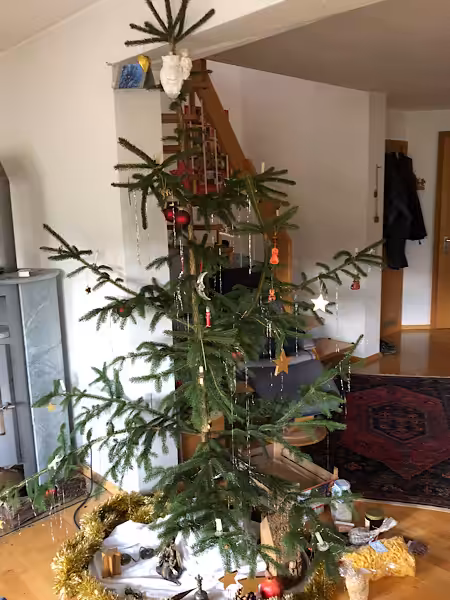 Seitdem holen wir unseren Weihnachtsbaum direkt aus der Fichtenhecke – am 24.12. wird der obere Teil eines Baumes abgeschnitten. Der untere darf weiterwachsen. Kein Schönheitswettbewerb, dafür echter Bezug.