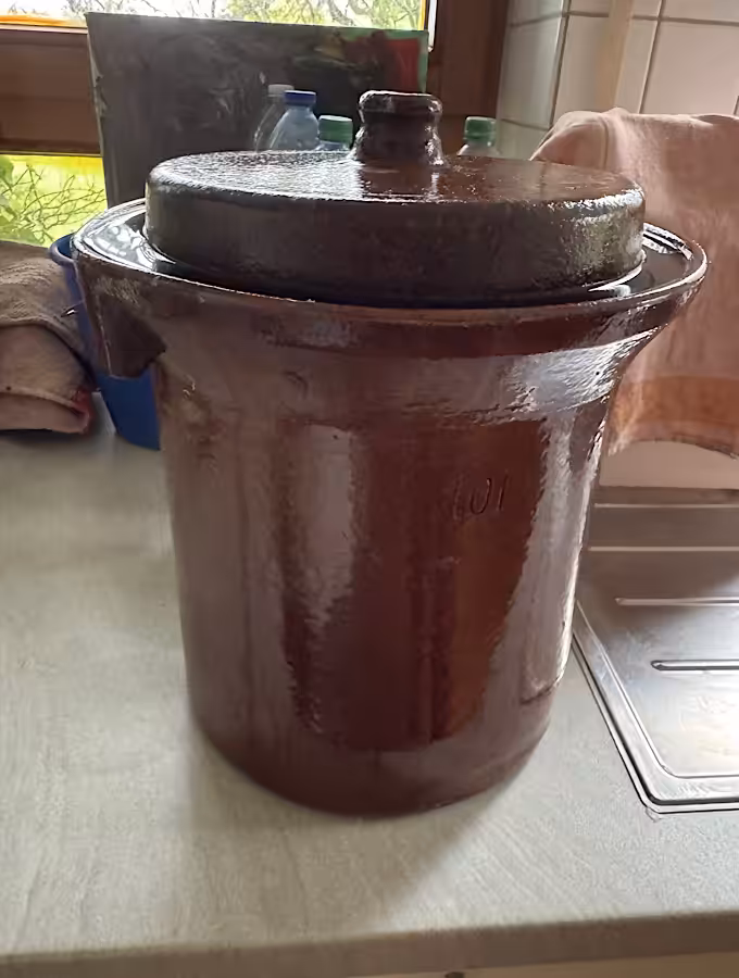Er hatte Filderkraut angesetzt – jetzt steht der Steinguttopf bei uns,