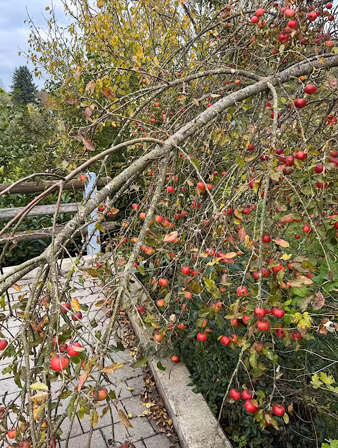 Direkt daneben noch ein Zierapfelbaum. Auch da nahm ich zwei Zweige mit für die Vase. Hab ich doch erst diese Woche gesehen, dass man aus Zieräpfeln Pektin gewinnen kann – und das dann als natürliches Geliermittel verwenden kann. Statt Gelierzucker. Was es alles gibt! Ich hab sie nur für die Vase.