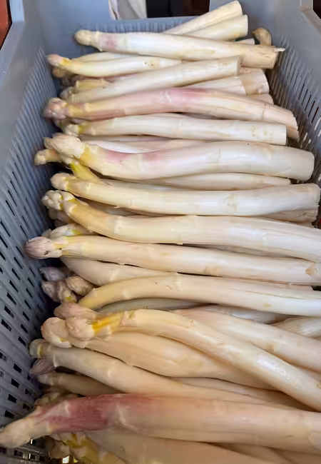 Rund um unseren Wohnort gibt es mindestens fünf kleine Spargelhäuschen – jedes mit eigenem Konzept. Manche bieten zusätzlich Obst, andere haben schon auf Erdbeeren umgestellt. Einige haben noch grünen Spargel im Sortiment, den Anthony William besonders empfiehlt. Verpackt wird überall gleich – aber die Unterschiede in Preis, Auswahl und Atmosphäre sind spürbar. Meine geliebten krummen Spargel bekomme ich übrigens nur an einem Stand.