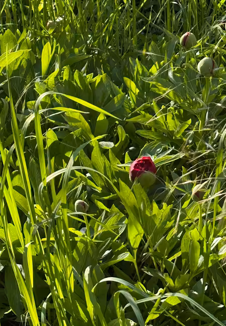 Die Tulpen sind verschwunden, die Pfingstrosen gekommen – und auch schon wieder gegangen. Die Knoblauchsrauke vergeht langsam, Akelei, Butterblumen, Zitronenmelisse und Spitzwegerich übernehmen ihren Platz. Der Giersch ist da, die Brennnesseln auch. Es blüht, wächst, vergeht – wie jedes Jahr, und doch jedes Mal neu.