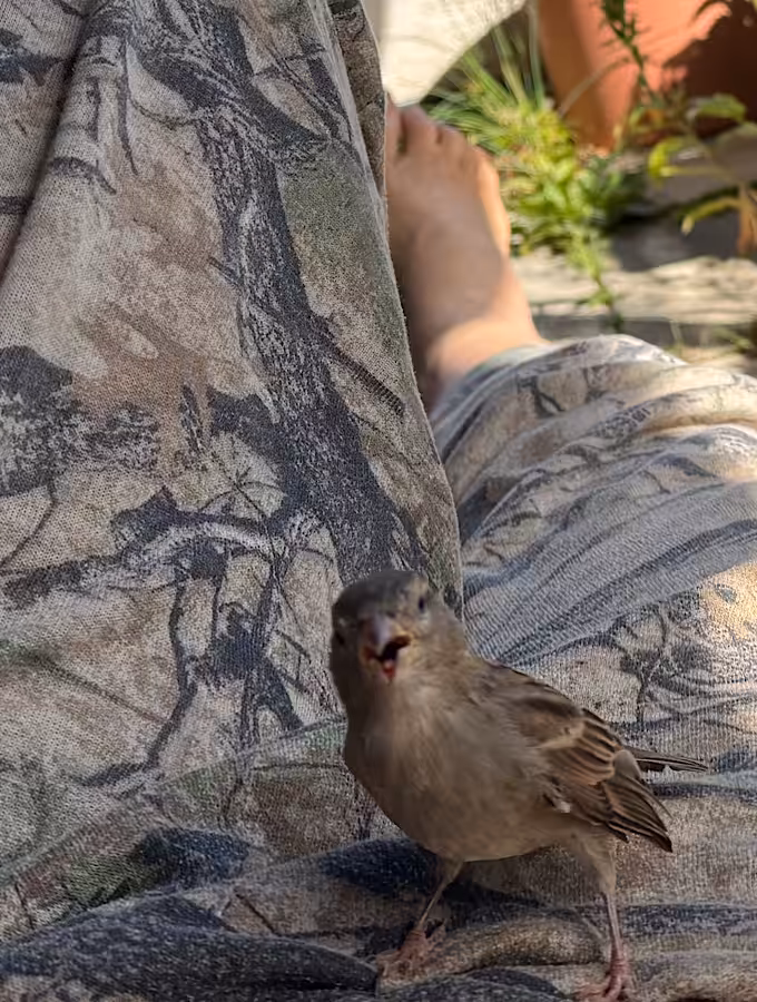 Ein zweiter Moment: Ich lag auf dem Balkon, als gleich zwei Spatzen gegen die Scheibe flogen. Es passierte ihnen nichts. Nach kurzem flogen sie wieder weiter. Dann kam einer, der setzte sich sogar direkt auf meinen Bauch – und ließ sich fotografieren. So nah war mir bisher noch kein Wildvogel.