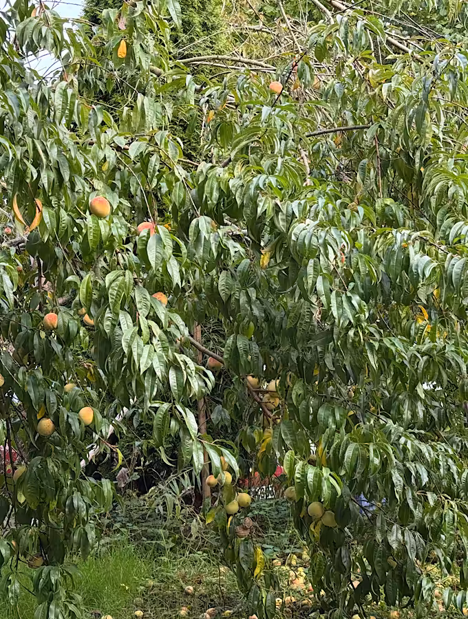 Und dann unser Pfirsichbaum: voll bis obenhin. So viele Früchte, dass etliche auf dem Boden lagen, als wir aus dem Urlaub heim kamen. Es waren noch genug zum Ernten. Die Pfirsichschwemme wurde zu Marmelade und Mus – herrlich zu Bratkartoffeln. Ganz praktisch: jetzt kann ich auch wieder unter dem Baum parken, was vorher wegen der Früchte nicht möglich war.