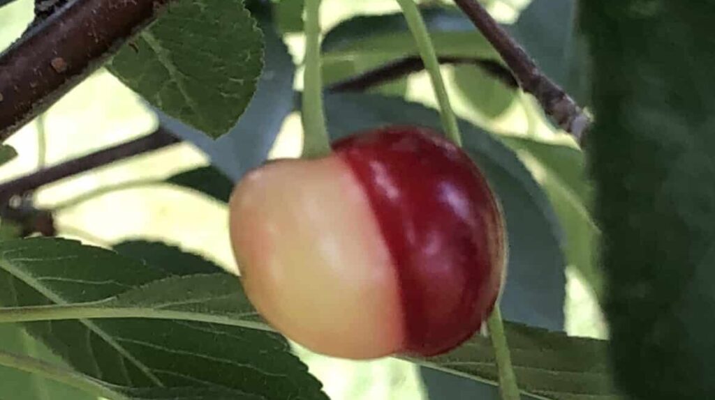 Doch ich fand etwas Ähnliches: eine Kirsche, zur Hälfte hell, zur Hälfte tiefrot.
