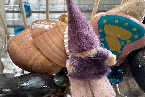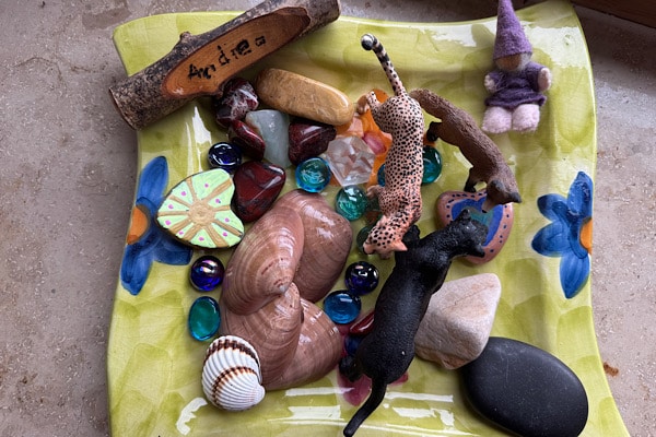 Dann packte mich kurz der Rappel – wie man hier im Schwäbischen sagt. Der bemalte Teller mit Schleichtieren, Steinen, Muscheln und einem kleinen Zwerg war staubig. Also alles abgewaschen, getrocknet und wieder an seinen Platz gestellt. Sauber.