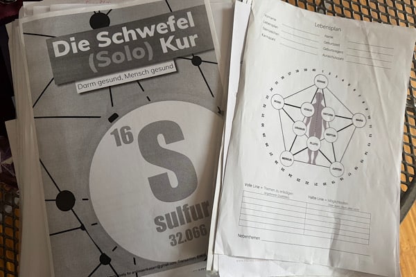 Ich suchte weiter nach Unterlagen und stieß auf die Schwefelkur und auf Human Design. Beides hat noch keinen festen Platz. Will ich die Unterlagen zur Schwefelkur aufbewahren? Ich habe sie vor Jahren gemacht, in der Annahme, mir etwas Gutes zu tun. Rückblickend frage ich mich, wie verrückt man manchmal ist.
