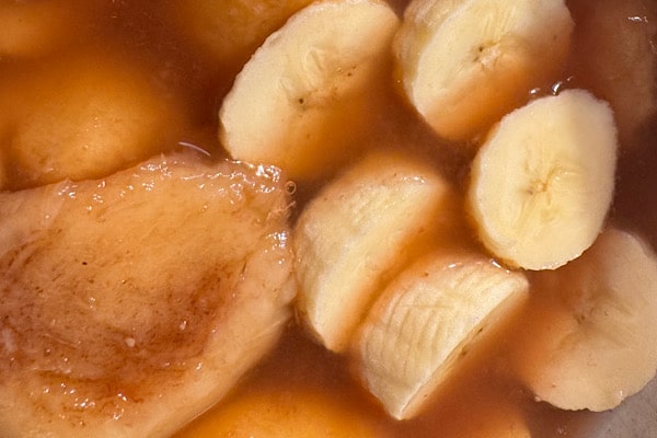 Im Sommer hatten wir extrem viele Pfirsiche und haben einige eingefroren. Eigentlich wollte ich Eis daraus machen. Neulich kam mir ein anderer Impuls: Warum nicht Kompott? Gefrorene Früchte mit etwas Wasser aufkochen, zum Beispiel mit Banane. Frisch schmeckt es besser – klar. Aber ein warmes Kompott am Abend, zwischen Ordnern gegessen, wärmt und erinnert an den Sommer.