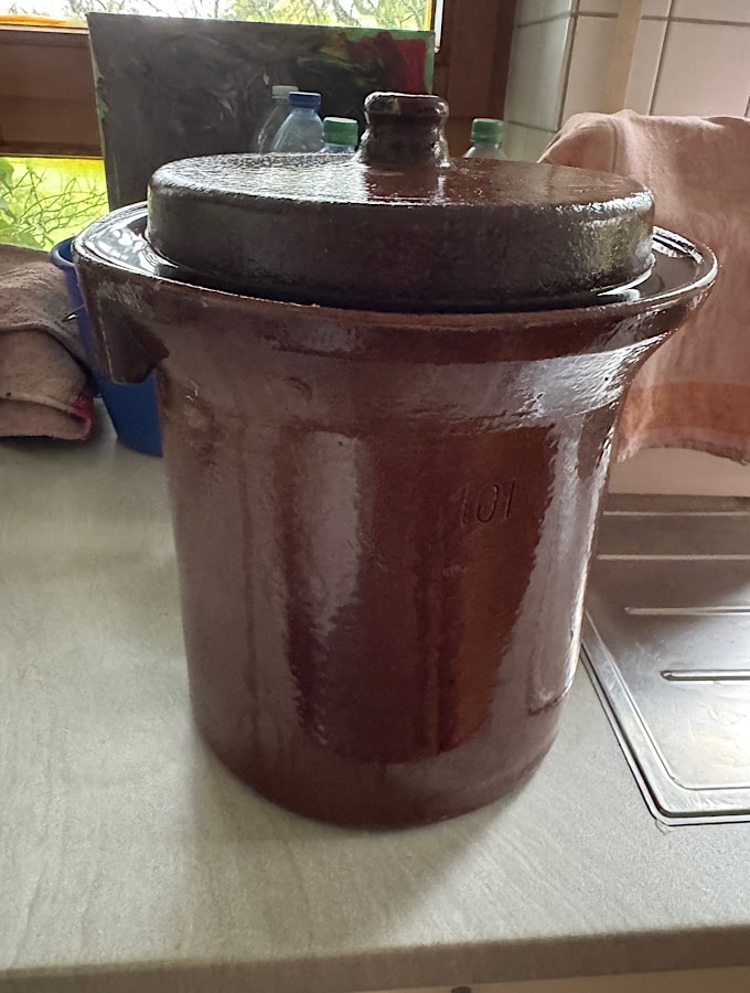 Der Gärtopf steht. Immer wieder Wasser nachfüllen und innenliegende Steine abwaschen. Dann gibts ab Weihnachten wieder eigenes Sauerkraut.