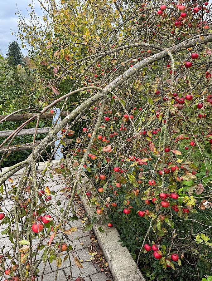 Direkt daneben noch ein Zierapfelbaum. Auch da nahm ich zwei Zweige mit für die Vase. Hab ich doch erst diese Woche gesehen, dass man aus Zieräpfeln Pektin gewinnen kann – und das dann als natürliches Geliermittel verwenden kann. Statt Gelierzucker. Was es alles gibt! Ich hab sie nur für die Vase.